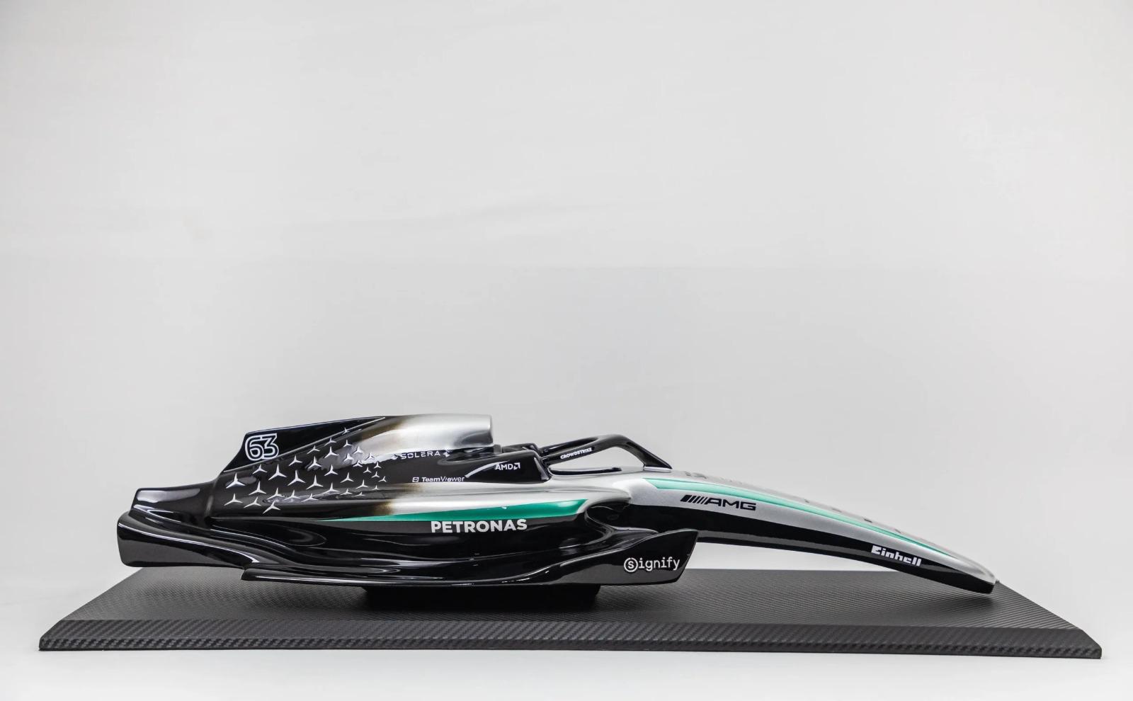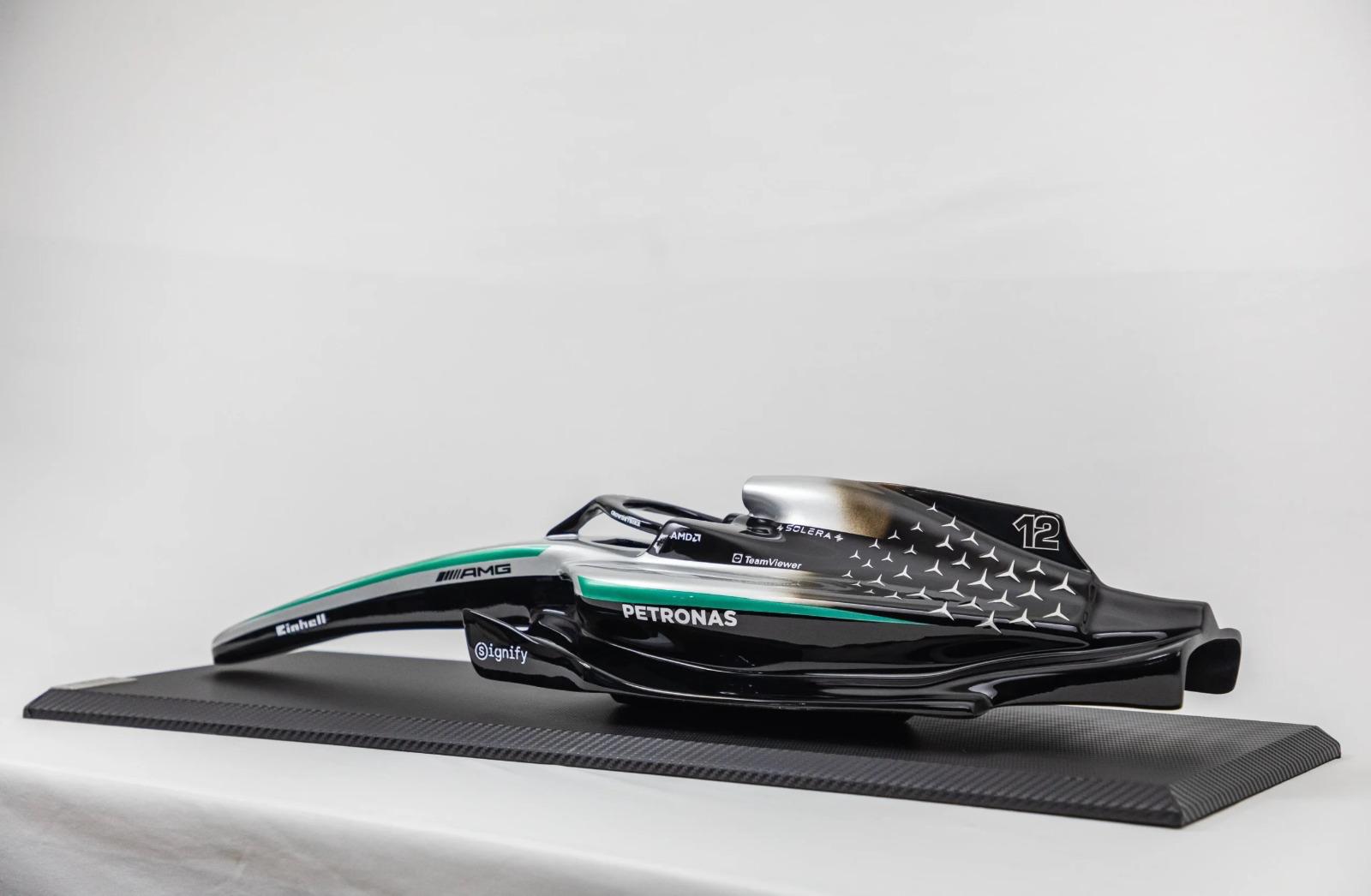 This limited edition Mercedes AMG W16 sculpture is a refined artefact of modern Formula1 design - a piece where precision craftsmanship meets the pure aesthetics of elite racing engineering. Hand-formed in premium Fibreglass and finished in a deep, mirror-smooth glossy automotive paint, it captures the SF-25’s aerodynamic architecture with exacting detail, embodying the sensation of F1's Pure Speed gracefully frozen in stillness. Produced in an exclusive limited run of just 100 pieces, each sculpture is individually numbered to ensure absolute rarity.